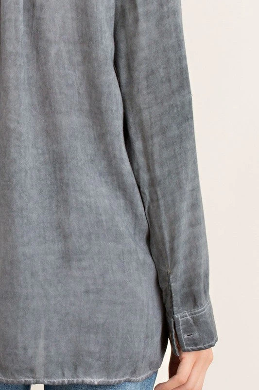 Stressed Charcoal Long Sleeve Blouse has a loose fit feeling. This blouse is a wonderful addition to any closet. It’s Front lace up adds great detail. Soft to the touch and sexy on all body types. Light weight .Also comes in grey. Rayon