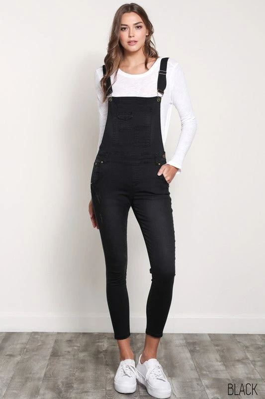 “Sassy & Fun” skinny-fit black denim overalls fit awesome, comfortable. Wear all year round.spandex stretch/denim