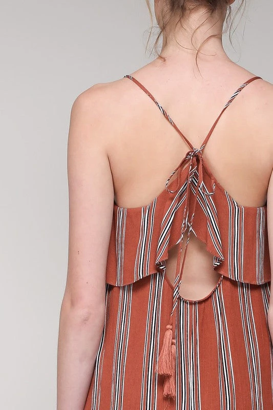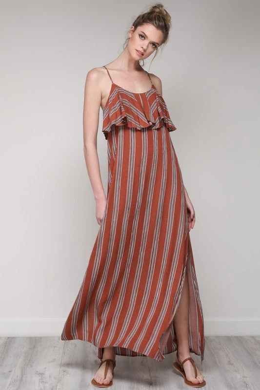 This beautiful striped maxi dress in terra cotta is ready for the spring and summer and great accent to any closet. Model is wearing a small.Rayon
