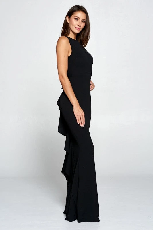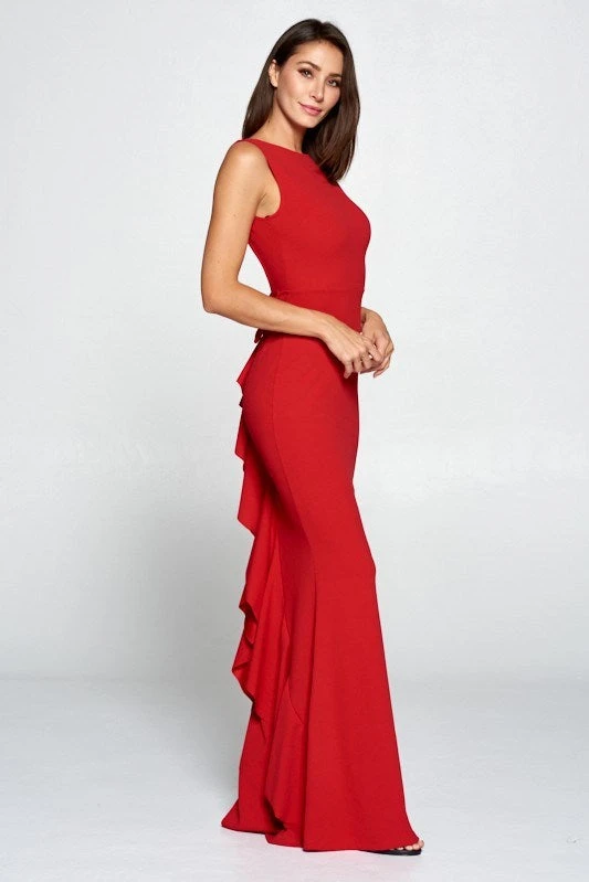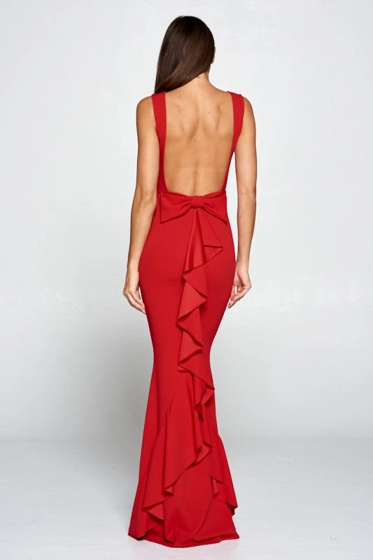 “Take Me Out” Red Bow Ruffle Dress. I can see you walking in that room, like a walking gift. This red bow dress with a swooped back and back ruffle is absolutely GORGEOUS!! Poly/spandex/final sale