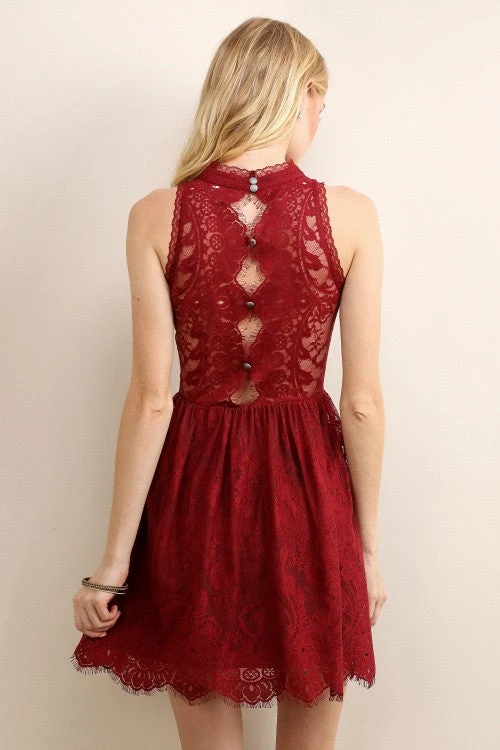 “Lace fit Dress, Antique Button Up Back” Feminine Lace Halter Dress in Black or Wine. 100%polyester