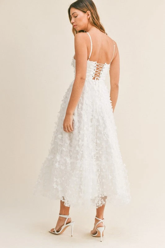 WHITE BUTTERFLY MESH LACE UP BACK BUSTIER MIDI DRESS