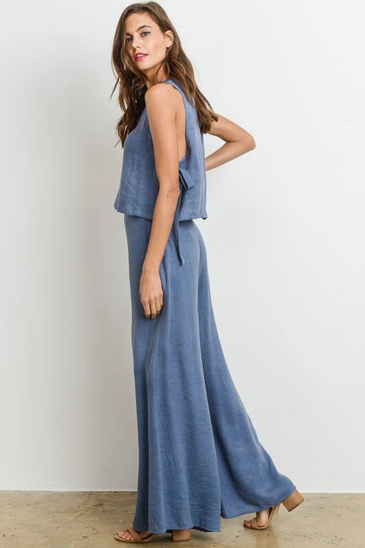 Women’s Pants & Smock Neck Top, is a definite must have, beautiful draped wide leg pants are very slimming to the body. The smock neck top with its side ties is a delicate statement. A great addition this women pant suit for your summer closet.poly/